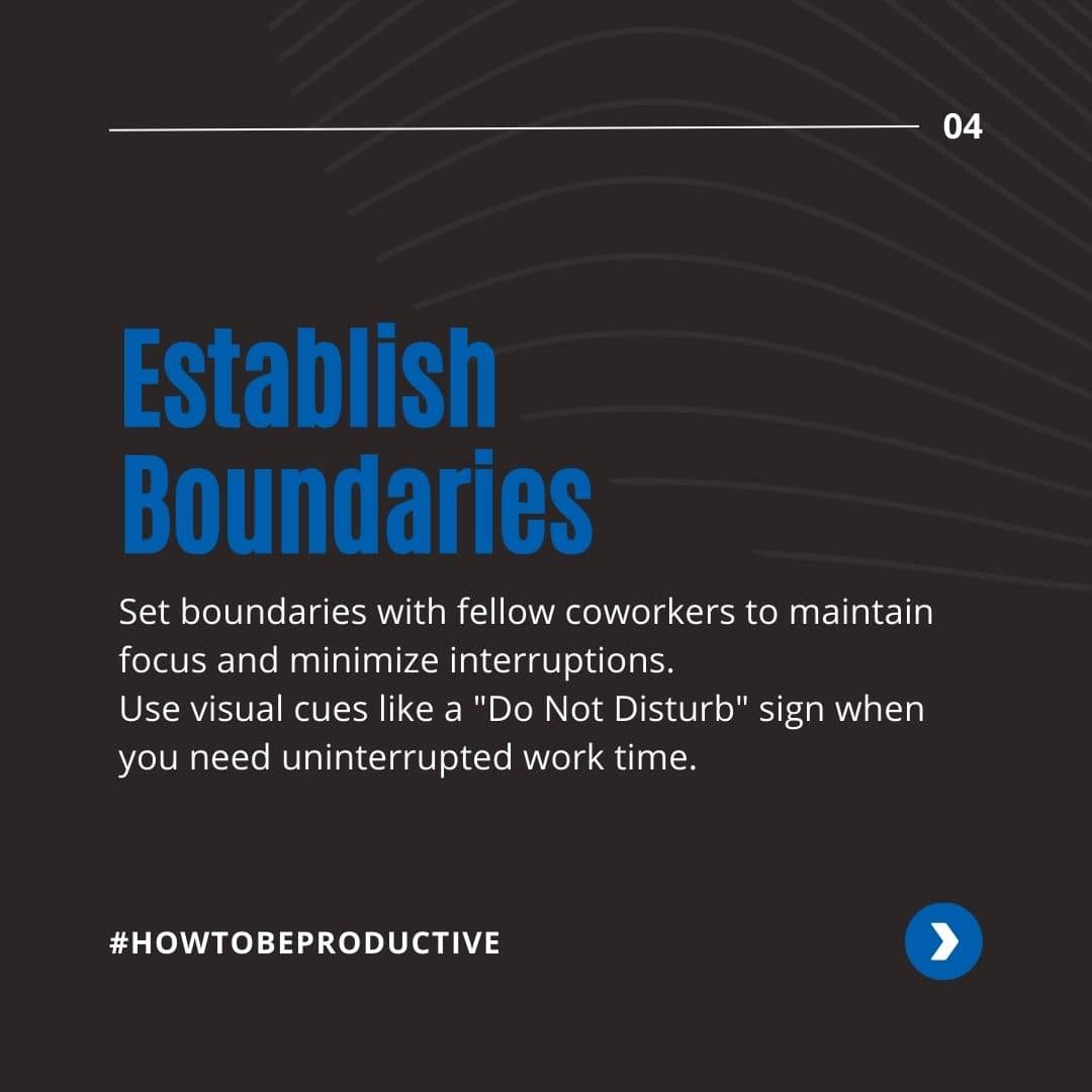 - Set boundaries with fellow coworkers to maintain focus and minimize interruptions.